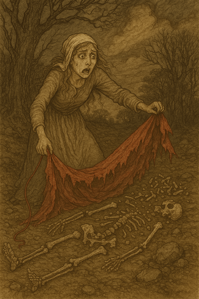 Taol-ha-taol e santas e harze an neudenn un tammig bihan etre he daouarn. Ha souezh geti é welet e turc’hae neuze sonn d’an diaz. Hag an neudenn a-barzh kroc’hen an douar siken ! A-nerzh ha hanter zallet get mouched an noz e skarzhas an delioù hag e skrabas an donenn du da gavout penn arall ar wiadenn. Buan e tizouaras sae he dousig kent d’he bizied tastornat tammoù kaletoc’h ha yenoc’h ha kompren e voe eskern ! Un atell eo a c’hronne he frof. Un huch a droc’has ken ma tidrouzas ar forest un herrad. Pennfollet a-grenn e troas kein hag e strebotas kuit trema parrez Sei.